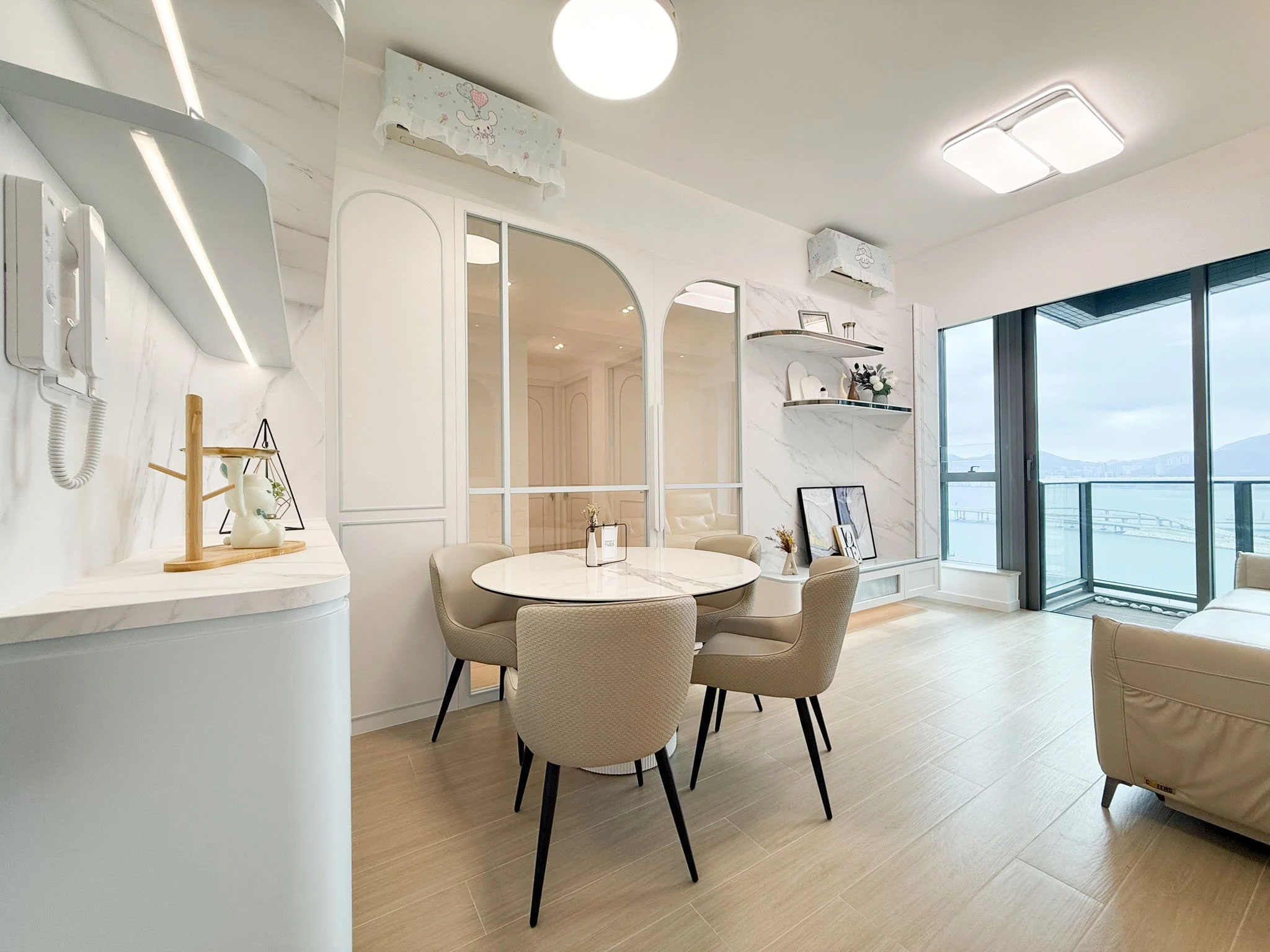 單位中的業主因為偏愛藍色,因此設計師為單位采用偏向地中海風格配色方案,家具和裝飾品則以淺色木質和米色調為主,呼應地中海風格的自然質感。大量使用圓拱造型的門框和鏡面,反映了地中海建築的典型建築元素。